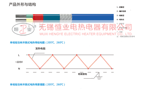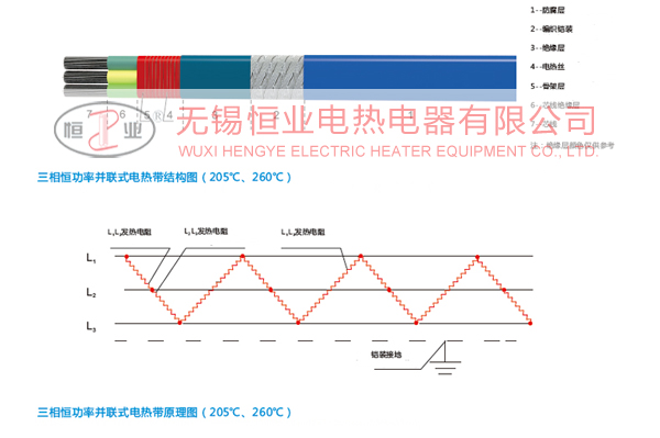 恒功率并聯式電熱帶的電源母線為二根或三根平行絕緣銅絞線,在骨架層上纏繞鎳鉻絲,并將電熱絲每隔一定距離相間交叉即“發熱節長”與母線連接,形成連續并聯電阻,母線通電后,各并聯電阻發熱,因而形成一條連續的電熱帶。